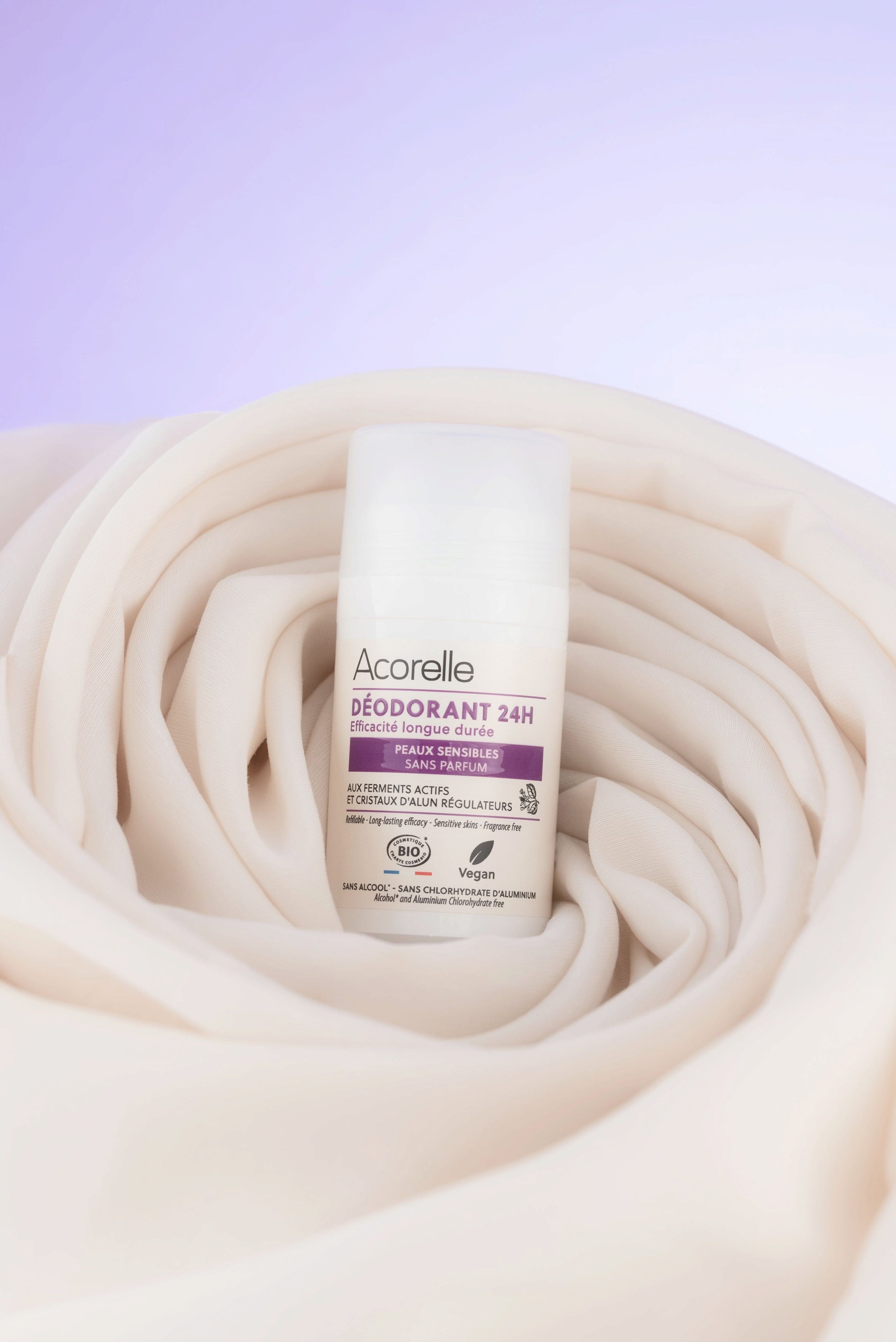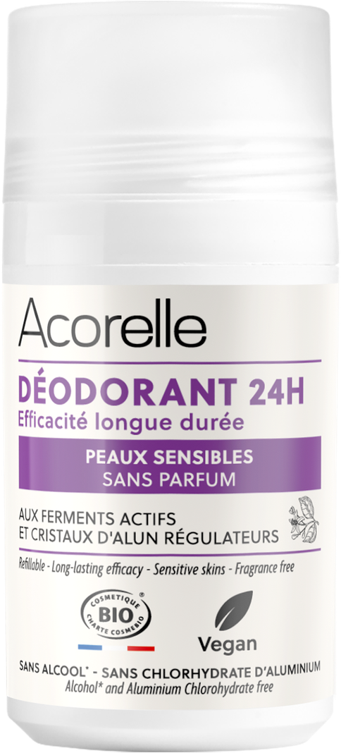 Aluminiumkristaller reglerar svettning genom att hämma tillväxten av luktframkallande bakterier. Samtidigt lugnar kamilleblomvatten känslig hud och gör den mjuk, medan mandelolja återfuktar och återupplivar. Den blommiga, irisdoftande och pudriga doften är av 100% naturliga parfymämnen.
