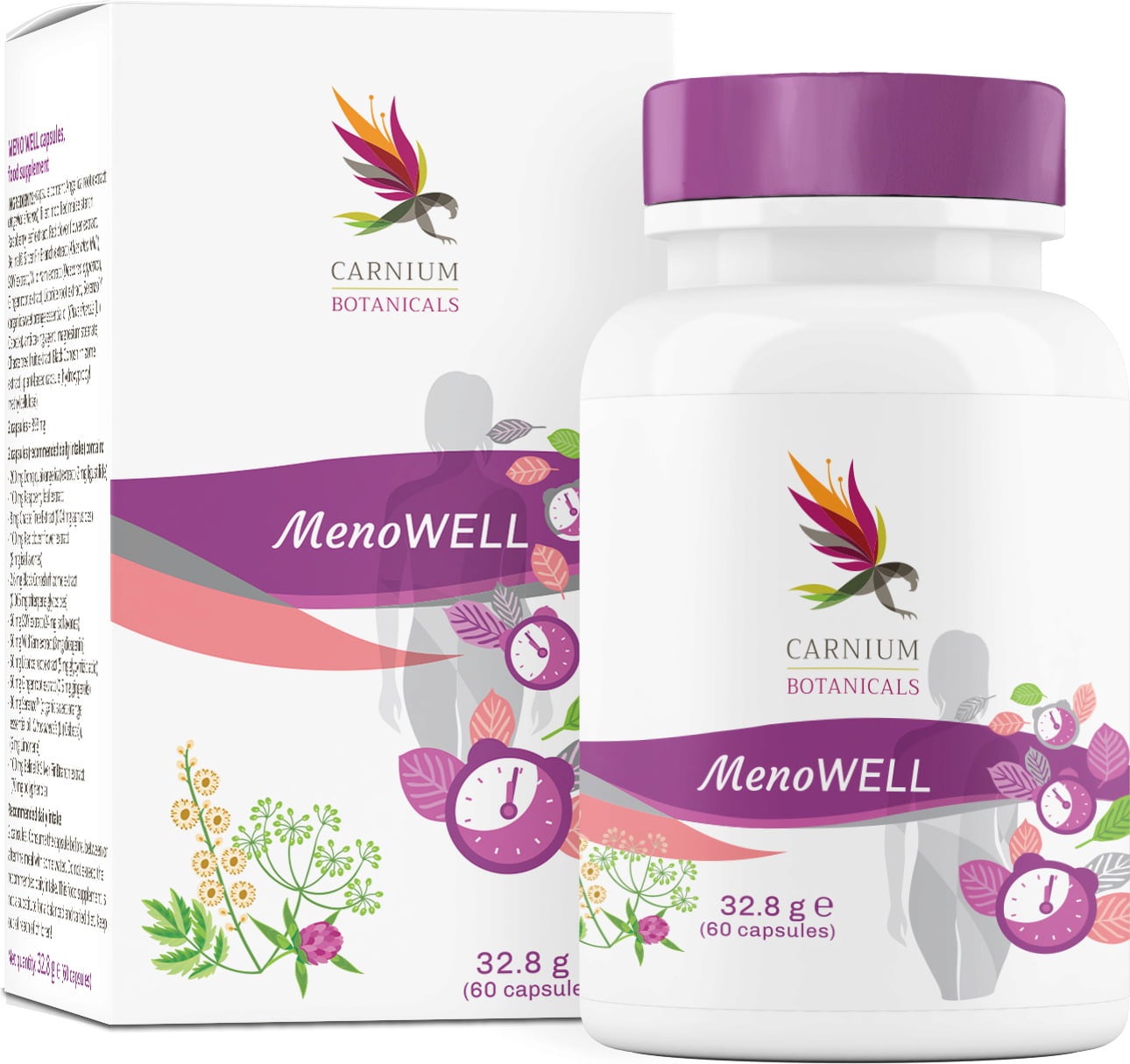 MenoWELL från Carnium Botanicals ger stöd till kvinnor under den tid då kroppen genomgår hormonella förändringar. Värdefulla ingredienser som munkpeppar, jamsrot, hallonblad, rödklöverblad och dong quai (kinesisk kvanne) ger bästa möjliga stöd. Kapslarna är helt naturliga, veganska och glutenfria.