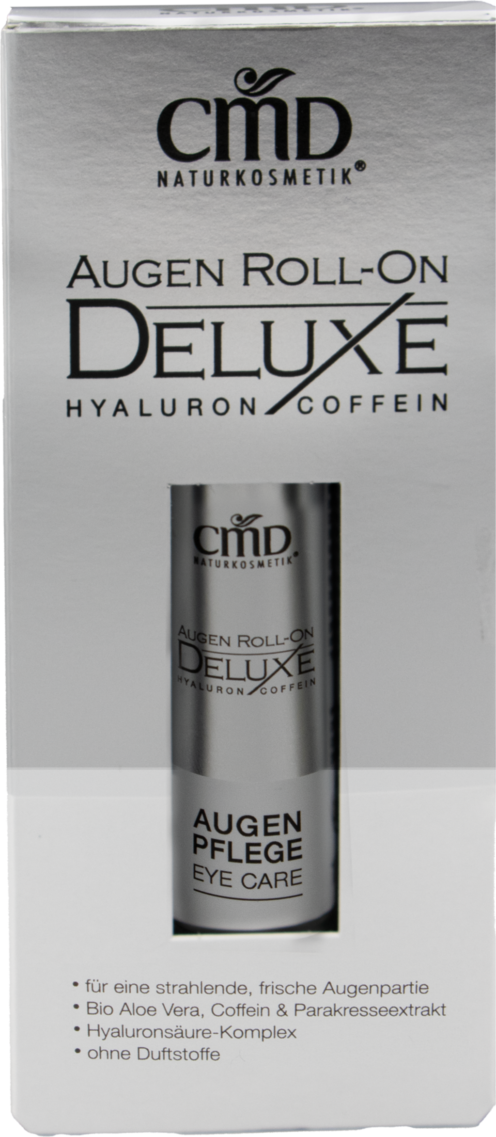 Den aktiva ingrediensrika Ögon Roll-On Deluxe återfuktar det känsliga ögonområdet optimalt för alla hudtyper. Samtidigt ger dess formula med aloe vera, koffein, parakrasse och hyaluronsyrakomplex friskhet och jämnhet. Roll-on-bollen i rostfritt stål ger en kylande effekt.