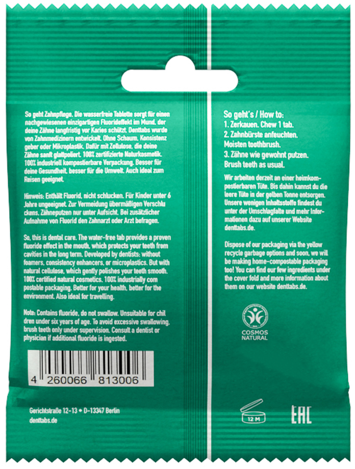 De innovativa DENTTABS tandkrämstabletterna är ett effektivt alternativ till konventionell tandkräm. Tack vare sin speciella sammansättning poleras tänderna och ger därför inte längre en yta för plack och missfärgningar att attackera. Resultatet blir slätare, renare och friskare tänder. Dessutom remineraliserar fluoret i DENTTABS tänderna mer effektivt och på ett mer målinriktat sätt än fluortandkräm. Och det bästa av allt: en mjuk tandborste är det perfekta medlet för att nå målet.