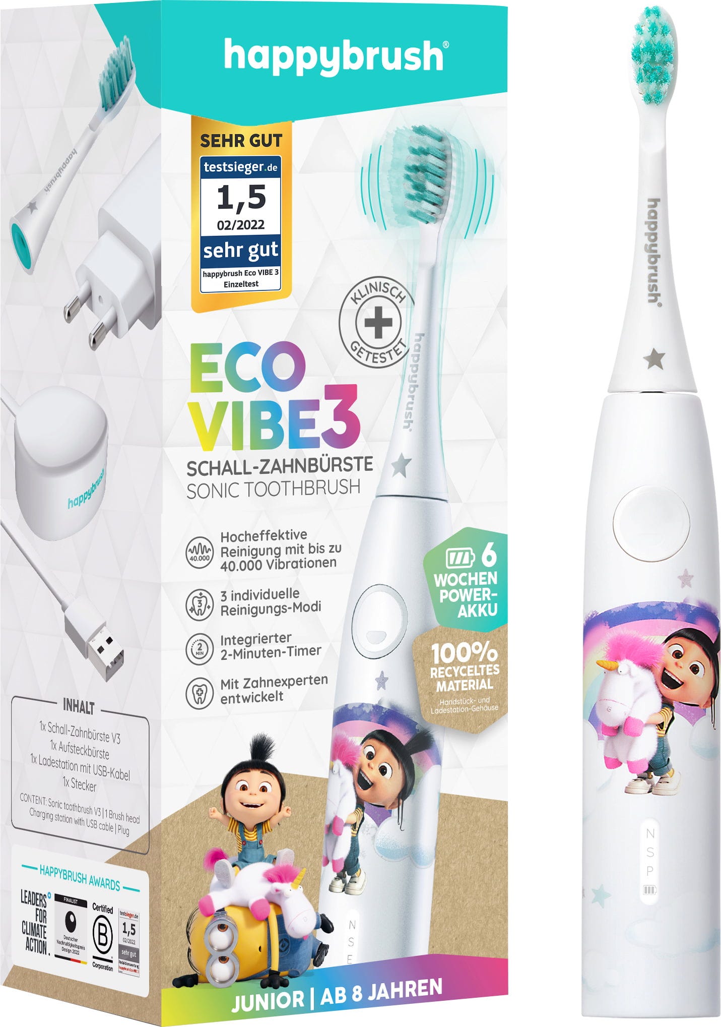 Här kommer den perfekta tandborsten för orädda hjältinnor, enhörningsfans och framtida superskurkar från 8 år och uppåt! Den är tillverkad av återvunnen plast. Borstens mycket effektiva vibrationer rengör tänderna skonsamt och på ett barnvänligt sätt, medan den integrerade timern hjälper till att borsta alla kvadranter jämnt. Så att du kan visa upp ditt vackraste leende med ett glatt "Banana!"!