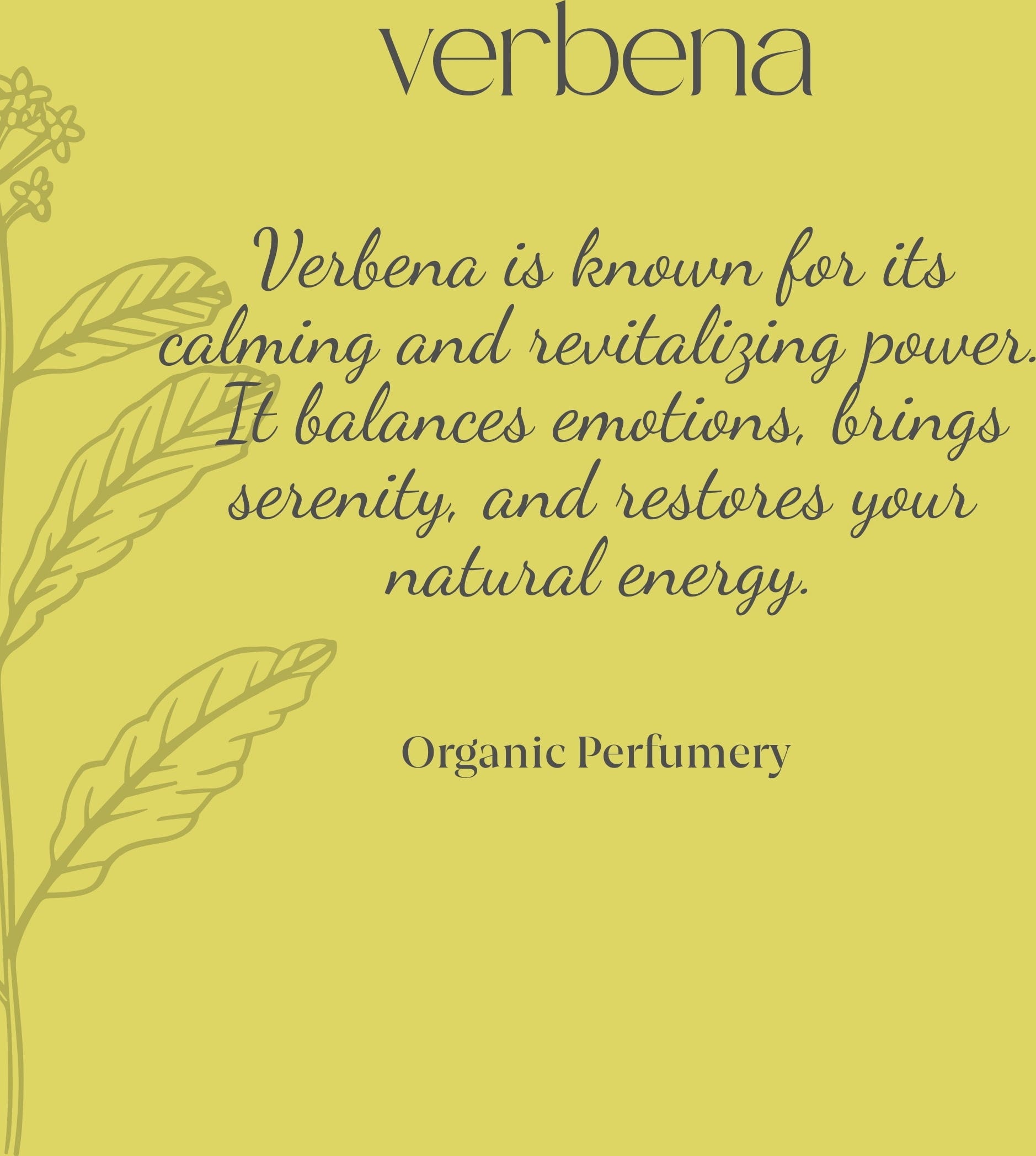 Fylld med naturens, havets och strandens kraft och fräschör, fängslar Verbena Organic Fresh Fragrance med sina uppfriskande aromer. Eau de Cologne är handgjord och macererad med en kvist ekologisk timjan eller verbena, beroende på säsong. Detta ger doften en ännu mer naturlig touch.