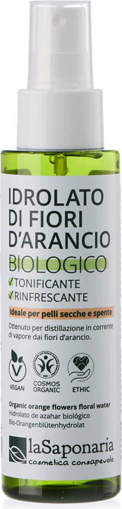 Det ekologiska apelsinblomshydrolatet från La Saponaria erhålls genom ångdestillation och är en helt naturlig, vegansk produkt. Dess hudlugnande, uppfriskande och regenererande egenskaper gör det till den perfekta vården för torr hud. Blomvattnet har även en avkopplande effekt och gör huden mjuk, strålande och delikat doftande.