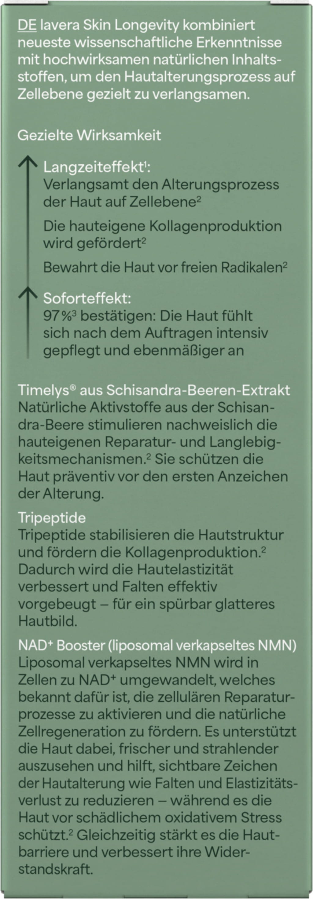 Skin Longevity Serum för Cellskydd har utformats som en riktad kompletterande hudvårdsprodukt för att bromsa hudens åldrandeprocess på cellnivå. Dess formula kombinerar innovativa ingredienser som NAD+ Booster tillverkad av liposomalt inkapslad NMN (nikotinamidmononukleotid), tripeptider och TIMELYS®-komplexet från schisandrabär. Serumet arbetar synergistiskt och kan positivt påverka hudens egen kollagensyntes och skydda den från fria radikaler. Detta hjälper till att förhindra de första tecknen på rynkor - för en slät, intensivt närd hudton.