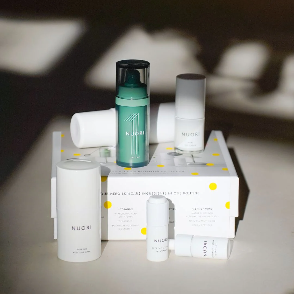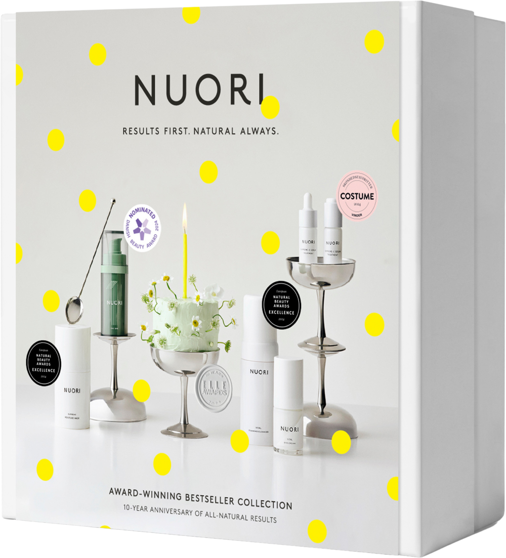 Denne 5-delte jubileumskolleksjonen tilbyr den ultimate, naturlige hudpleierutinen og inneholder fem bestselgende produkter for alle hudtyper. NUORI feirer 10 år med innovasjon ved å lansere dette prisbelønte jubileumskitet, kjent for flere prisvinnende formler. Hvert produkt i dette eksklusive settet er kjent for sin enestående kvalitet og renhet og blir produsert i små partier med velprøvde naturlige ingredienser. Fra dyptgående fuktighet til lysnende og styrking av hudbarrieren – dette omfattende rutinesettet representerer NUORIs engasjement for friskhet, bærekraft og strålende resultater.