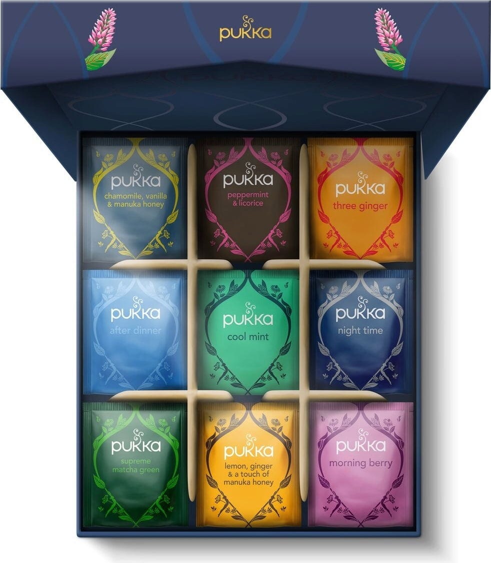 Den stora favorit-teförpackningen består av 9 olika teer som ger en varierad smakupplevelse. Tesorterna har noggrant valts ut av PUKKA:s experter enligt ayurvediska läror och kommer att skämma bort dig med sina balanserade smaker. Asken har också en vacker, blommig design som är ett riktigt blickfång och passar både för att presentera teerna och för återanvändning.