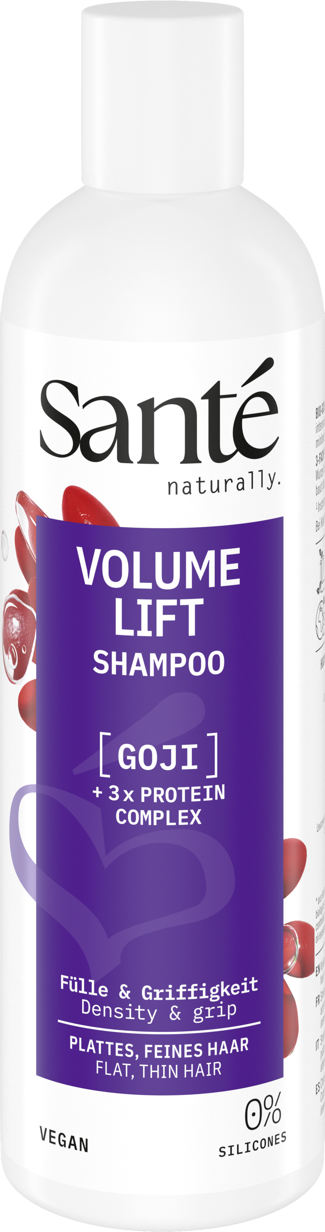 Volume Lift Shampoo från SANTE andas frisk luft i fint hår och ger värdefull fukt. Formulan gjord av ett trippelproteinkomplex och ekologiskt gojibärsextrakt bygger hårstrukturen från insidan med intensiv volym och ger en studsande man.