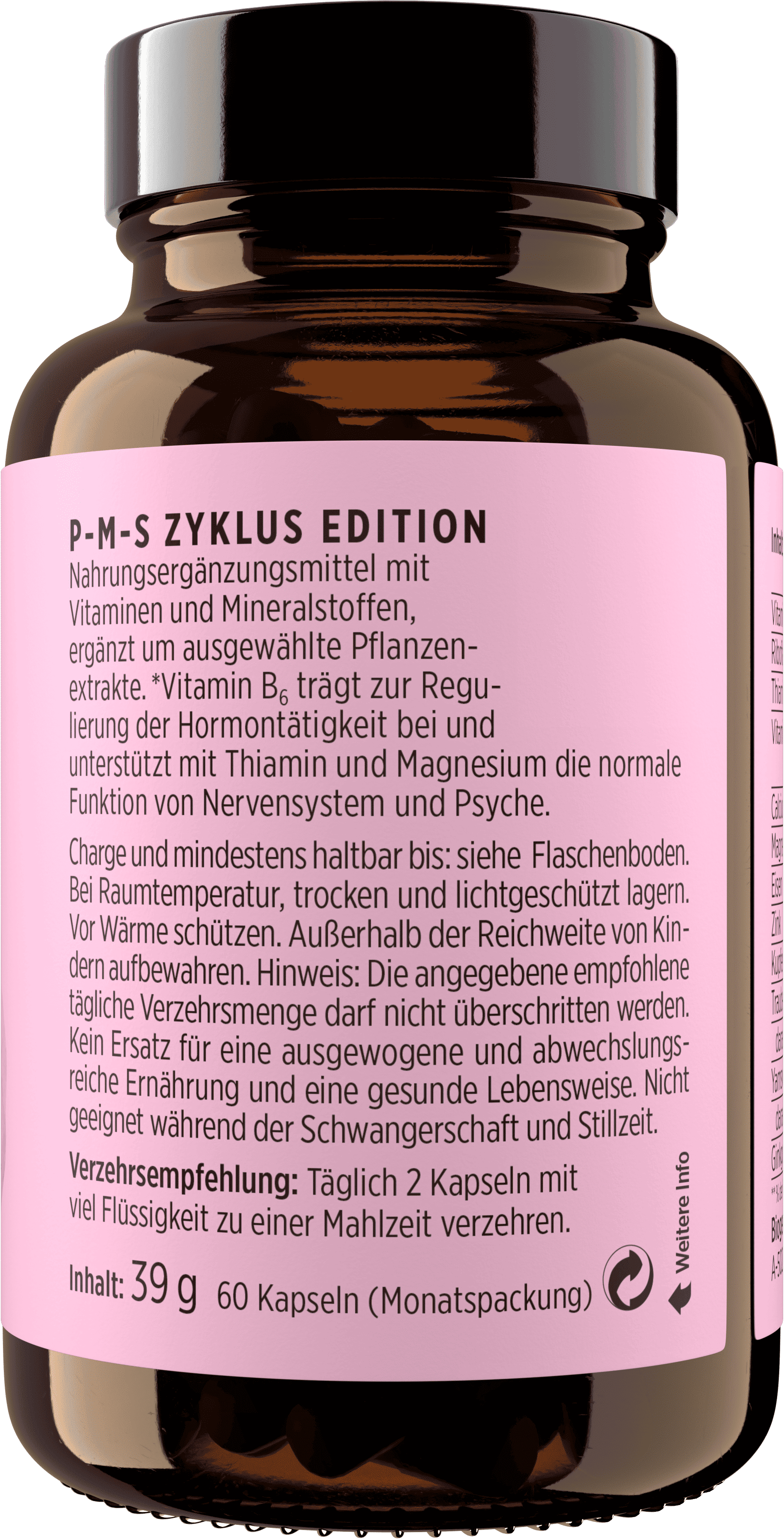 P-M-S Cycle Edition erbjuder en riktad kombination för kvinnor av vitaminer (B1, B2, B6, D), mineraler (magnesium i en blandning av fyra salter, kalcium, järn från två källor, zink, koppar) och växtextrakt (yamrot, ginkgo, druvkärna). Denna noggrant balanserade formel stöder regleringen av hormonell aktivitet samt psyke och nerver i syfte att kunna dra nytta av den fulla potentialen under din cykel. Rekommenderas för långvarig användning för att stödja P-M-S-symtom.