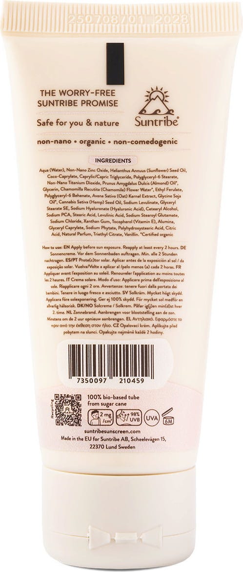 Aqua, Zinc Oxide (Non-Nano), Helianthus Annus (Sunflower) Seed Oil, Coco Caprylate/Caprate, Caprylic/Capric Triglyceride, Polyglyceryl-6 Stearate, Titanium Dioxide (Non Nano), Prunus Amygdalus Dulcis (Sweet Almond) Oil[1], Glycerin, Chamomilla Recutita Flower Water[1], Ethyl Ferulate, Polyglyceryl-6 Behenate, Avena Sativa (Oat) Kernel Extract, Glycerin Soja Oil[1], Cannabis Sativa (Hemp) Seed Oil, Sodium Levulinate, Glyceryl Stearate Se, Sodium Hyaluronate, Cetearylalcohol, Sodium Pca, Stearic Acid, Levulinic Acid, Sodium Stearoyl Glutamate, Sodium Chloride, Xanthan Gum, Tocopherol (Vitamin E), Alumina, Glyceryl Caprylate, Sodium Phytate, Polyhydroxystearic Acid, Citric Acid, Parfum, Triethylcitrate, Vanillin