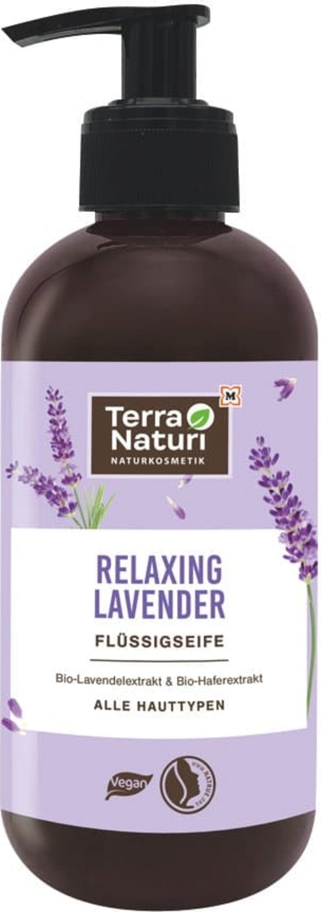 Mild flytande tvål, berikad med ekologiskt lavendel- och havreextrakt – Relaxing Lavender flytande tvål från Terra Naturi rengör dina händer med en vegansk och NaTrue-certifierad formulering.