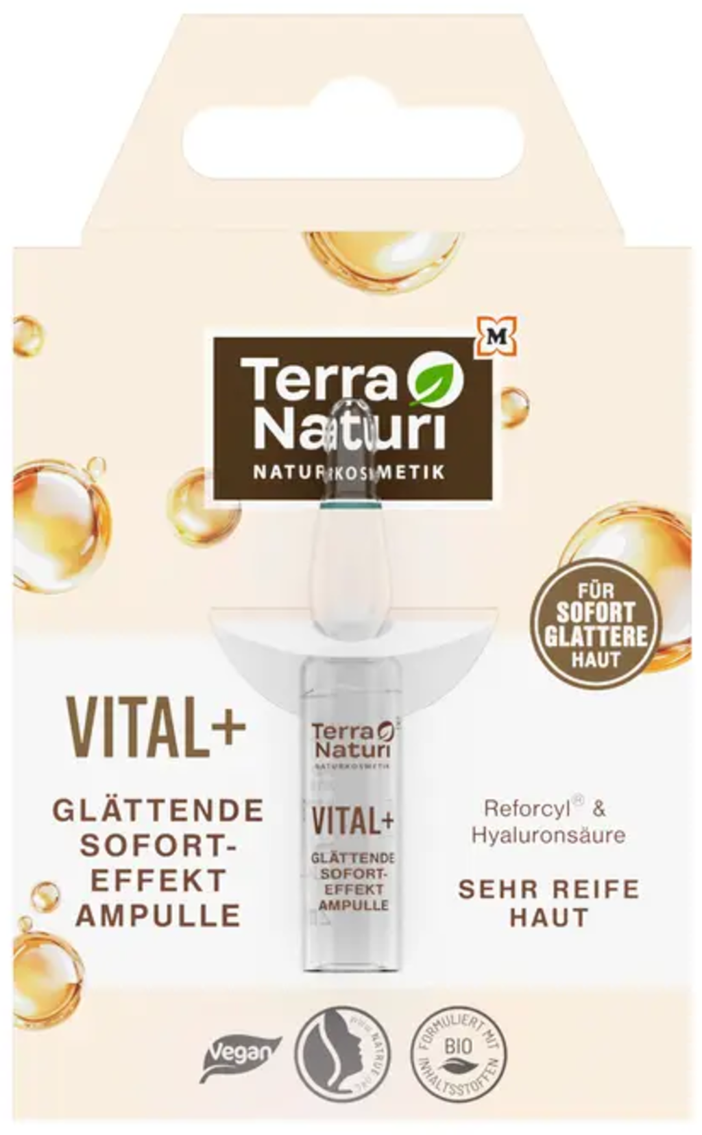 Formuleringen av denna ampull med Reforcyl® och hyaluronsyra kan stödja hudens lipidsyntes och därmed dess elasticitet. Den återfuktar intensivt mogen hud och erbjuder utjämnande egenskaper. Detta gör att huden ser fylligare och fräschare ut.