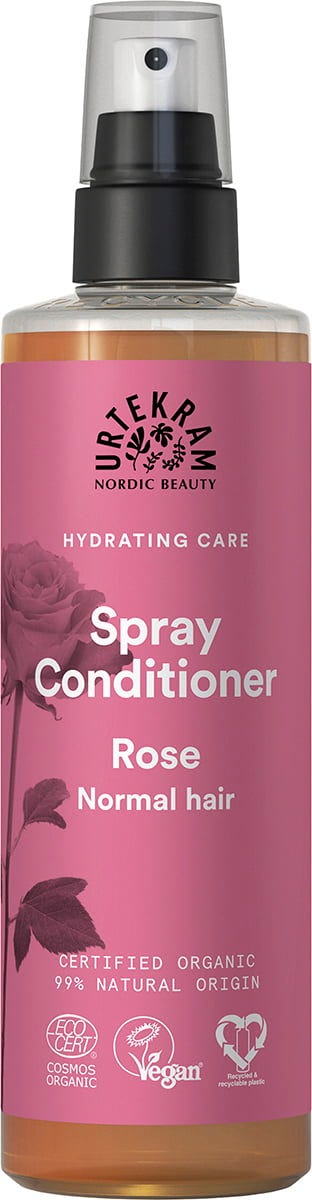 Urtekrams Rose Spray-Conditioner använder hyaluronsyra för att balansera hårets fuktbalans och därmed förhindra att det torkar ut. Dessutom görs håret mer smidigt. Lämplig för alla hårtyper.