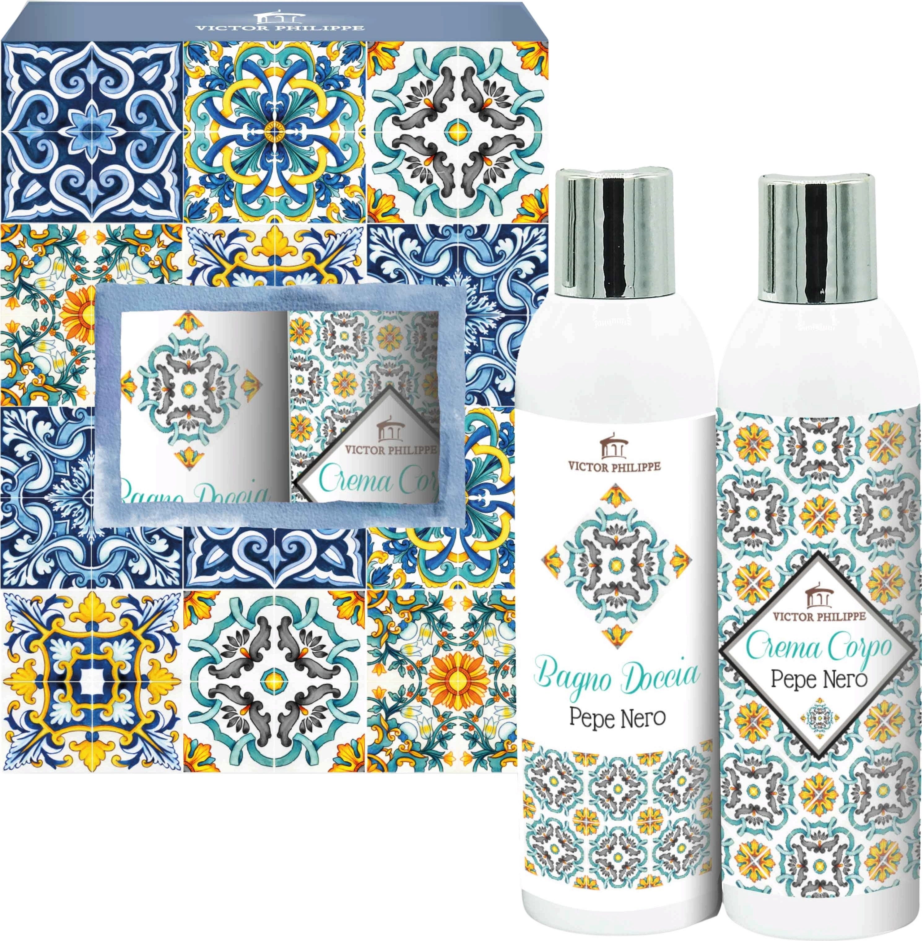 Pepe Nero-presentsetet är ett elegant erbjudande för alla som älskar varma, kryddiga och sofistikerade dofter. Det består av duschgel och kroppskräm och kommer förpackad i en ask vars design är inspirerad av azulejo-kakel – en present full av stil, värme och välbefinnande.